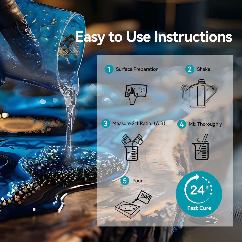 [EASY USE WITH A & B PART] Shake the bottle to mix the resin well. Mix the resin and hardener in a 2:1 ratio and stir for 3-5 minutes. Complete the project in 40 minutes.
