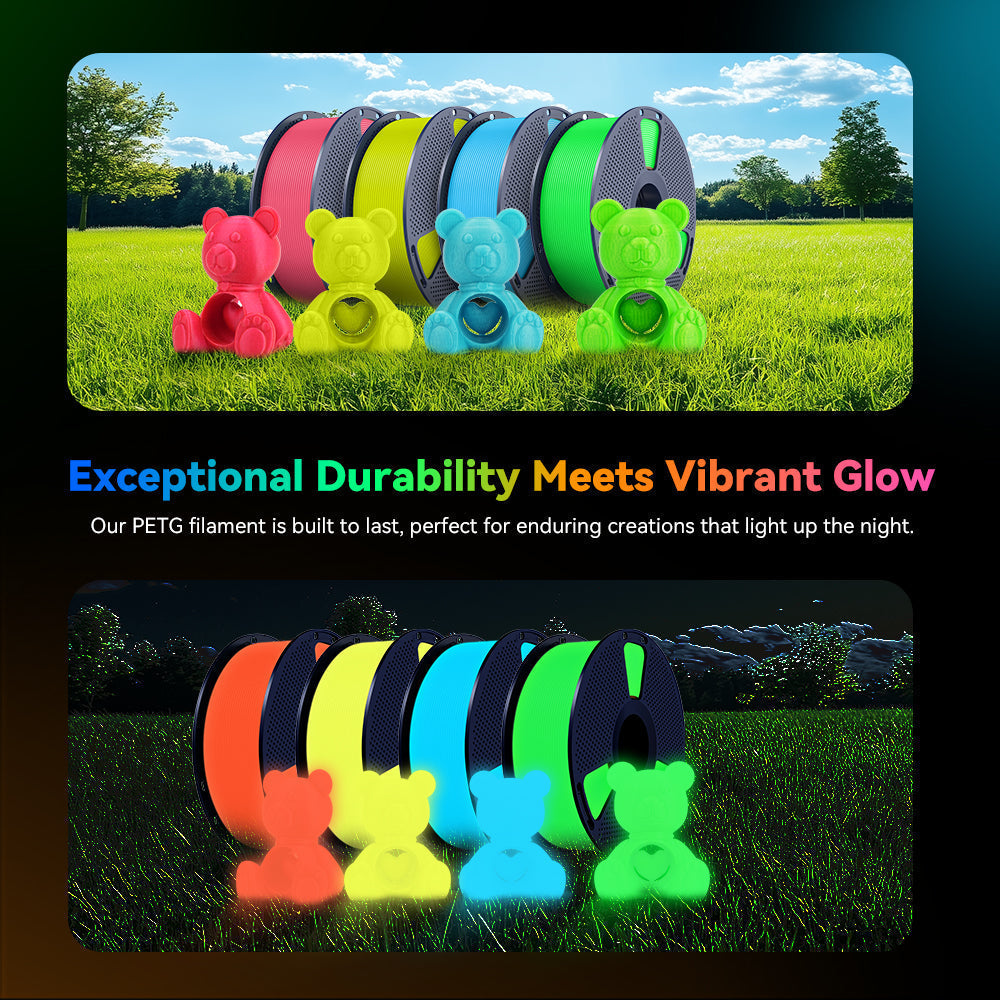 [Excellent Glow in Dark Effect] Absorb light can be luminous PETG at night (containing 10% luminous powder), luminous effect close to luminous PLA, at night or in a darker environment can be visualized luminous time of about 10 minutes.