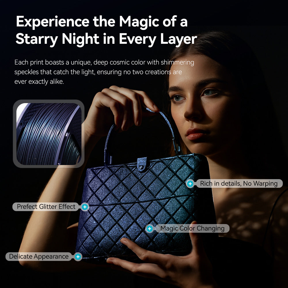Drawing inspiration from the beauty of the Milky Way, SUNLU PLA Galaxy filament combines a deep cosmic backdrop with sparkling starlight effects. Thanks to its ultrafine color-changing pearlescent powder (particle size <200µm), your 3D prints will reveal dynamic color shifts under different angles of light. The result is a dazzling, starry finish that makes every print look extraordinary and truly one-of-a-kind.